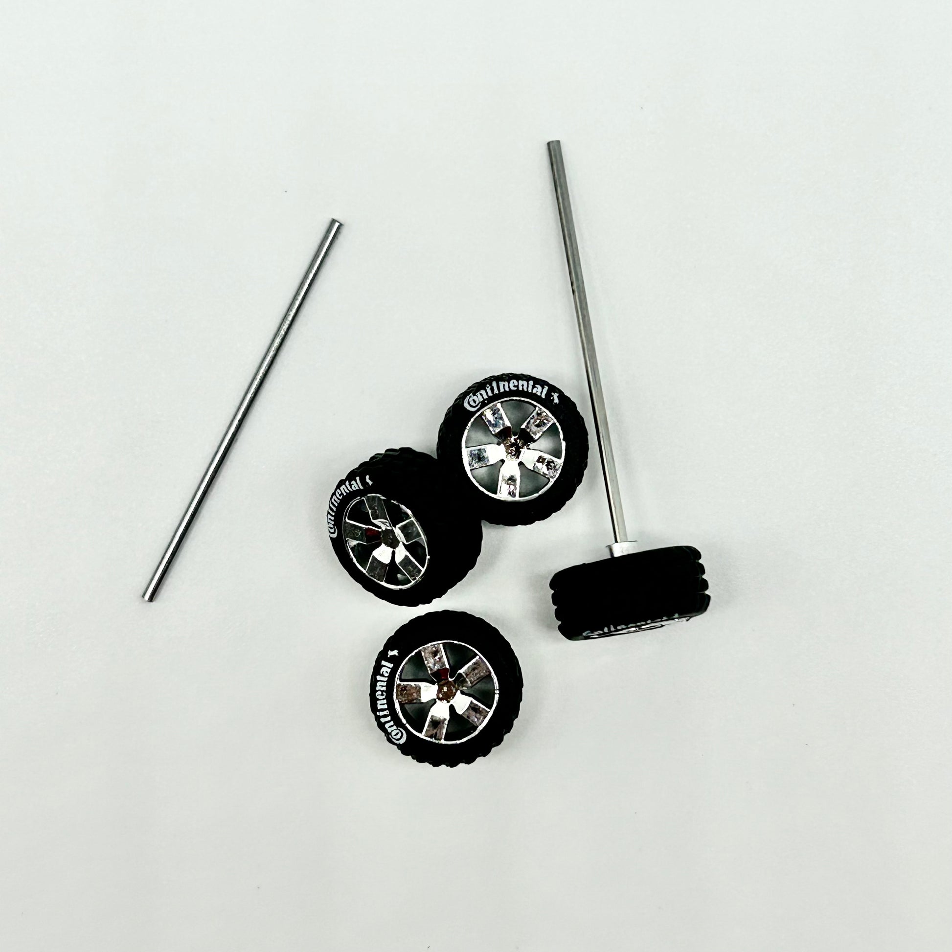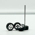 Traditional 14mm with thick 5 spoke wheels and large off-road rubber tires. Axles included.